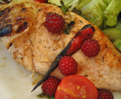 Kinder grillen Hähnchenbrüste und machen dazu einen schönen Kräutersalat mit japanischen Weinbeeren.